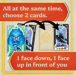 - Simultaneous champion selection: each player selects two cards, one revealed to the other players, the other remaining face down.