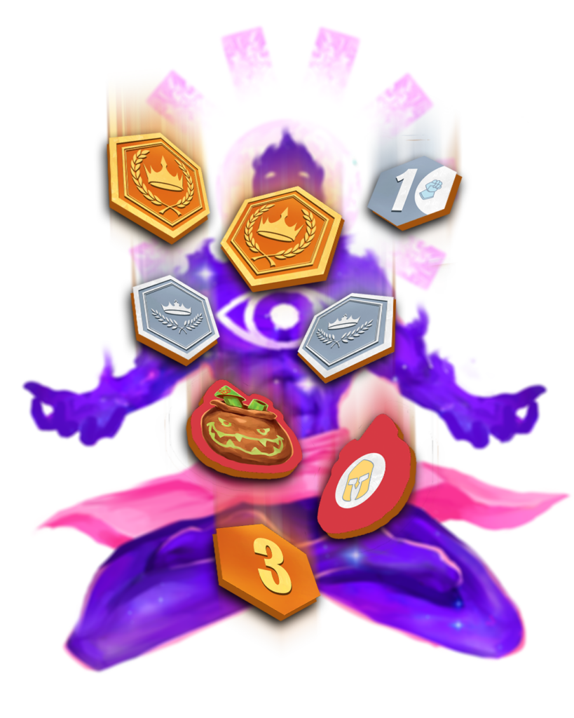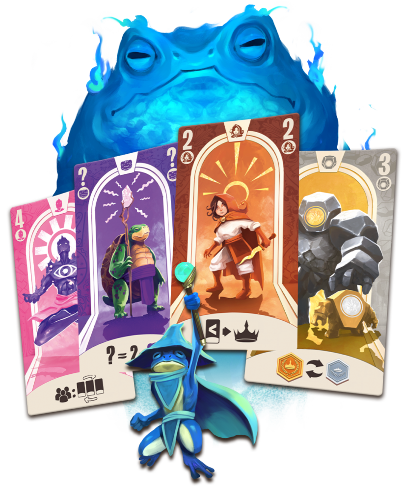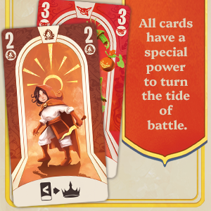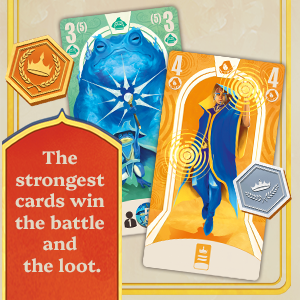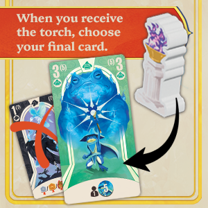 - Passing the torch: this initiative token passes from player to player, forcing you to choose your final champion from your two cards before passing it to the player of your choice.