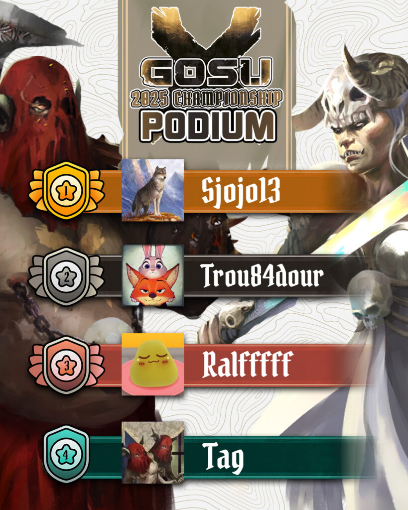 Cette année le championnat de Gosu X s’est déroulé en grande partie sur Board Game Arena ! Après une saison d’affrontements, 33 participants ont disputé les phases finales. Et c’est Sjojo13 qui a remporté le titre de Champion 2025, après Monchorizo en 2024 et Ryadh en 2023 ! Félicitations aussi au finaliste (2e) Trou84dour qui aura fait une très belle saison, ainsi que Ralfffff, qui finit en 3e place après un match dantesque contre Tag (4e place).